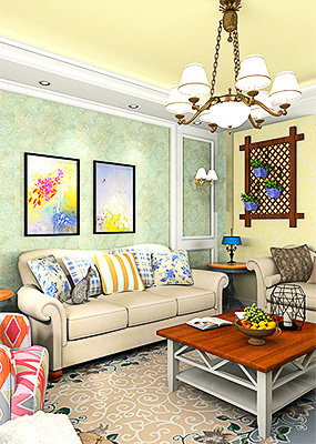 凹凸有致的图瑞卡翡翠背景效果,与浅米色美式沙发相得益彰,搭配墙面星烁迷幻金效果,温馨、舒适的美式田园...
